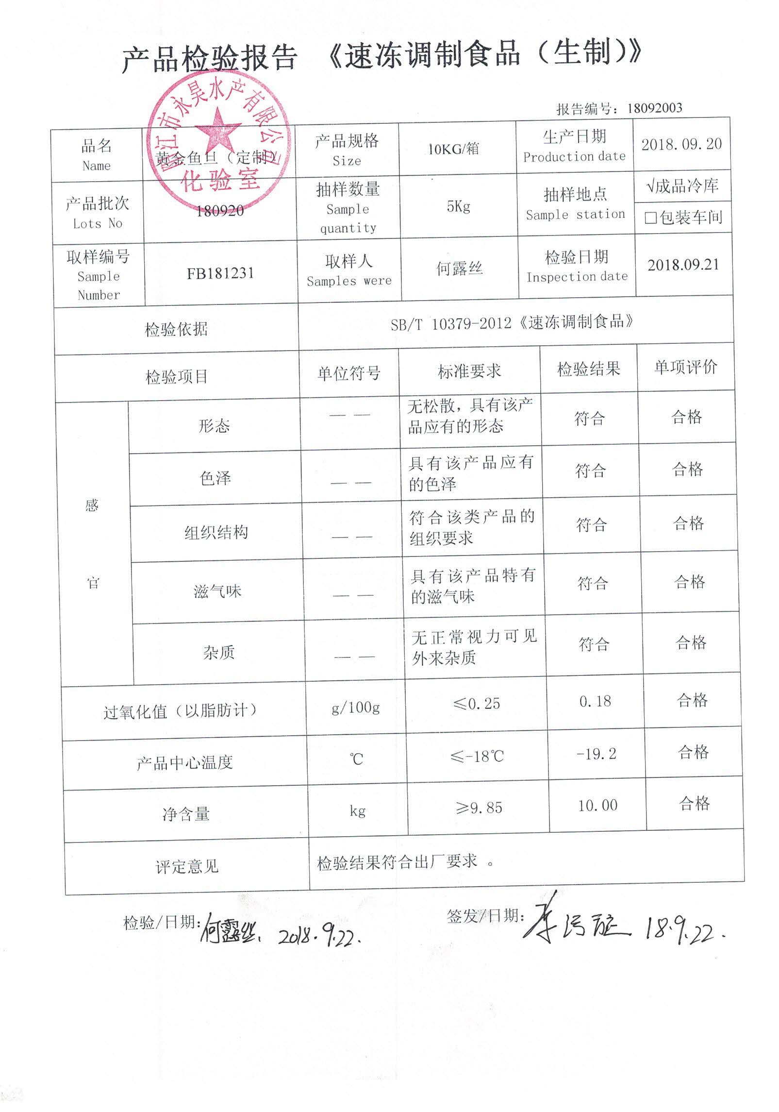 检测项目 :感官、过氧化值、产品中心温度、净含量