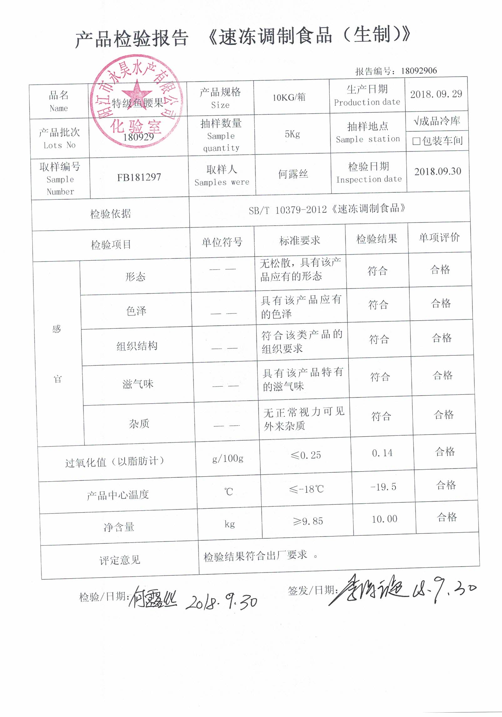 检测项目 :感官、过氧化值、产品中心温度、净含量
