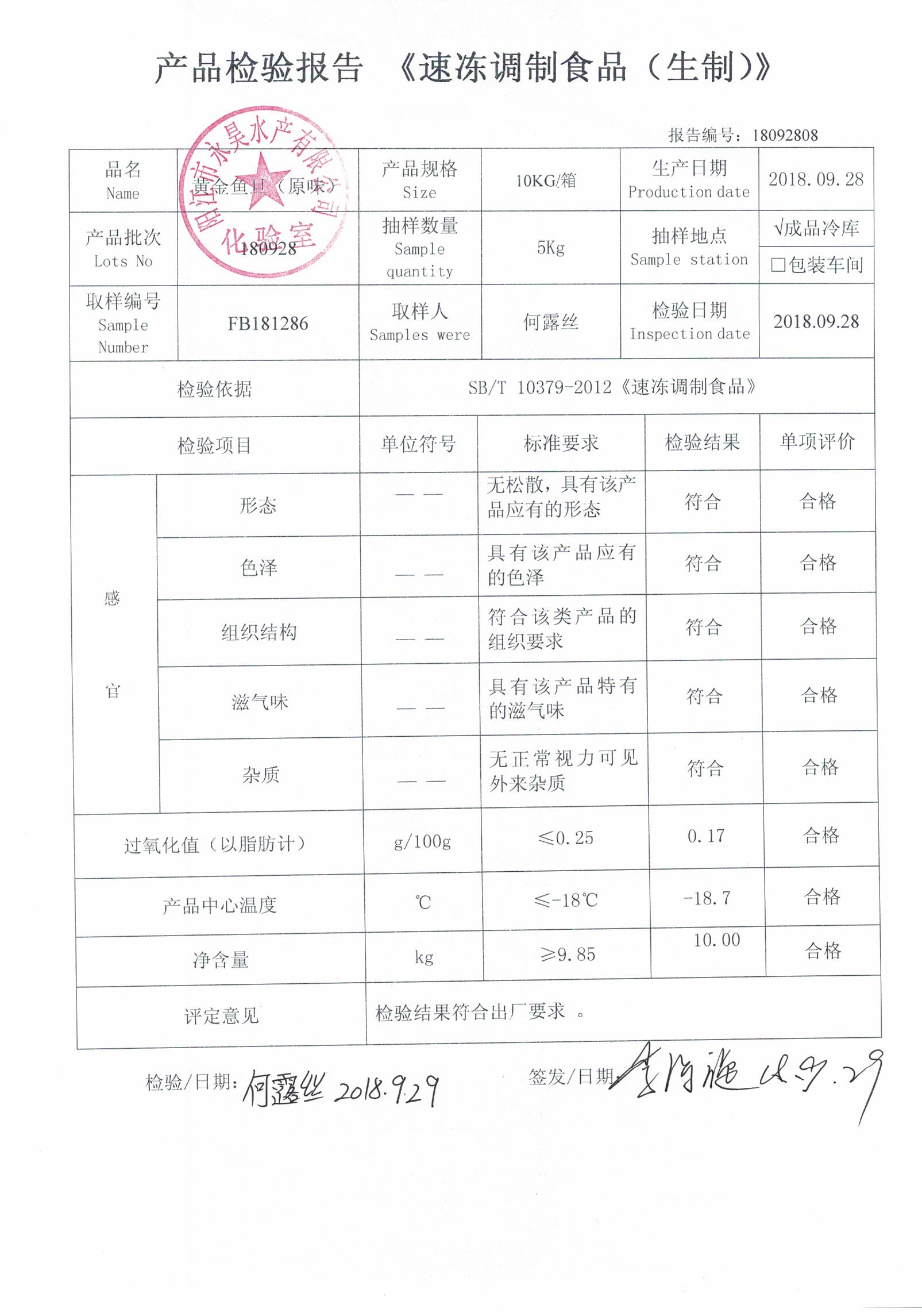 检测项目 :感官、过氧化值、产品中心温度、净含量