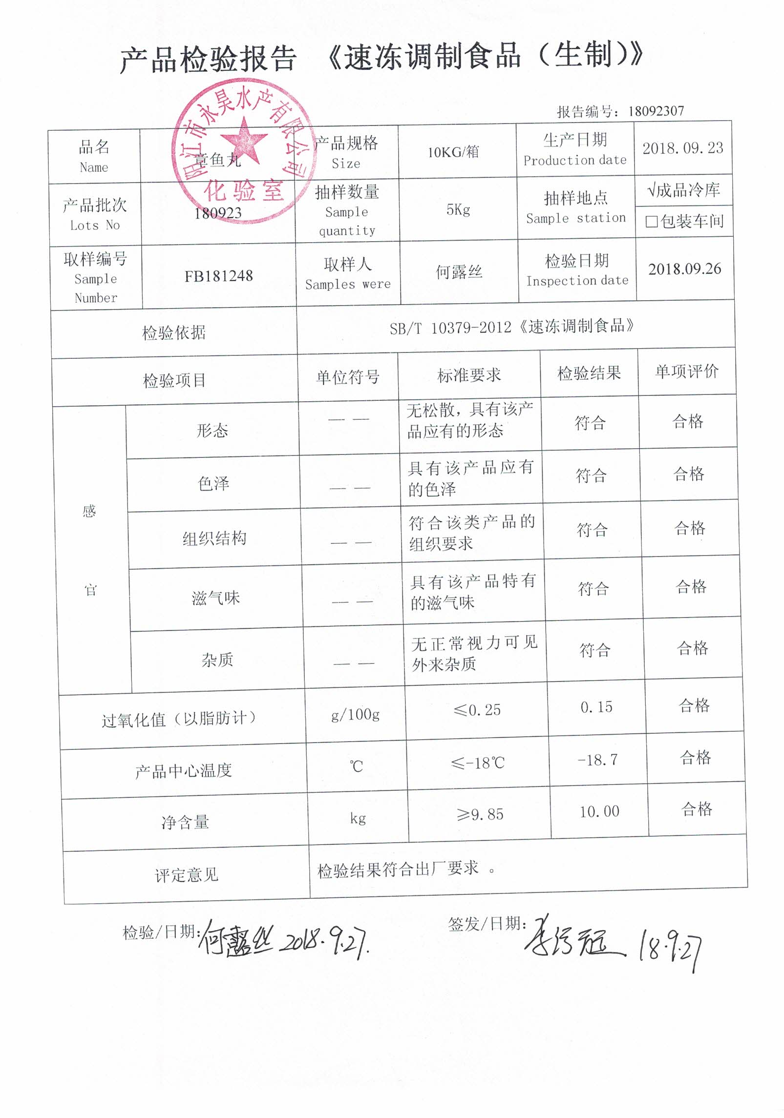 检测项目 :感官、过氧化值、产品中心温度、净含量